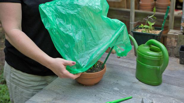 Insofern kein Frühbeet oder Gewächshaus vorhanden ist, kann sich mit einer Folienhaube beholfen werden. Dazu werden drei bis vier Stäbe als Halterung in den Gefäßrand gesteckt und anschließend mit einer Folientüte überspannt Alle paar Tage ist es erforderlich, die Pflanzen zu besprühen und damit die Luftfeuchtigkeit weiter zu erhöhen.